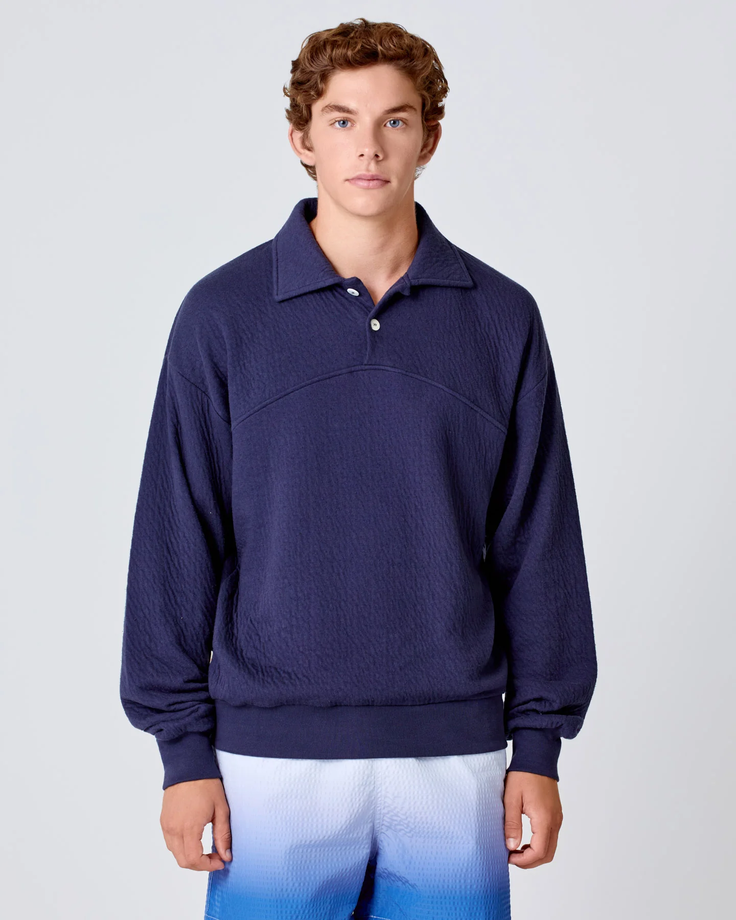 Brito, a half-button sweater with a collar, offers super-soft comfort. Its boxy fit and retro sportswear vibe make it perfect for breezy beach walks or heading to the gym. Also available in Grey Mesc.