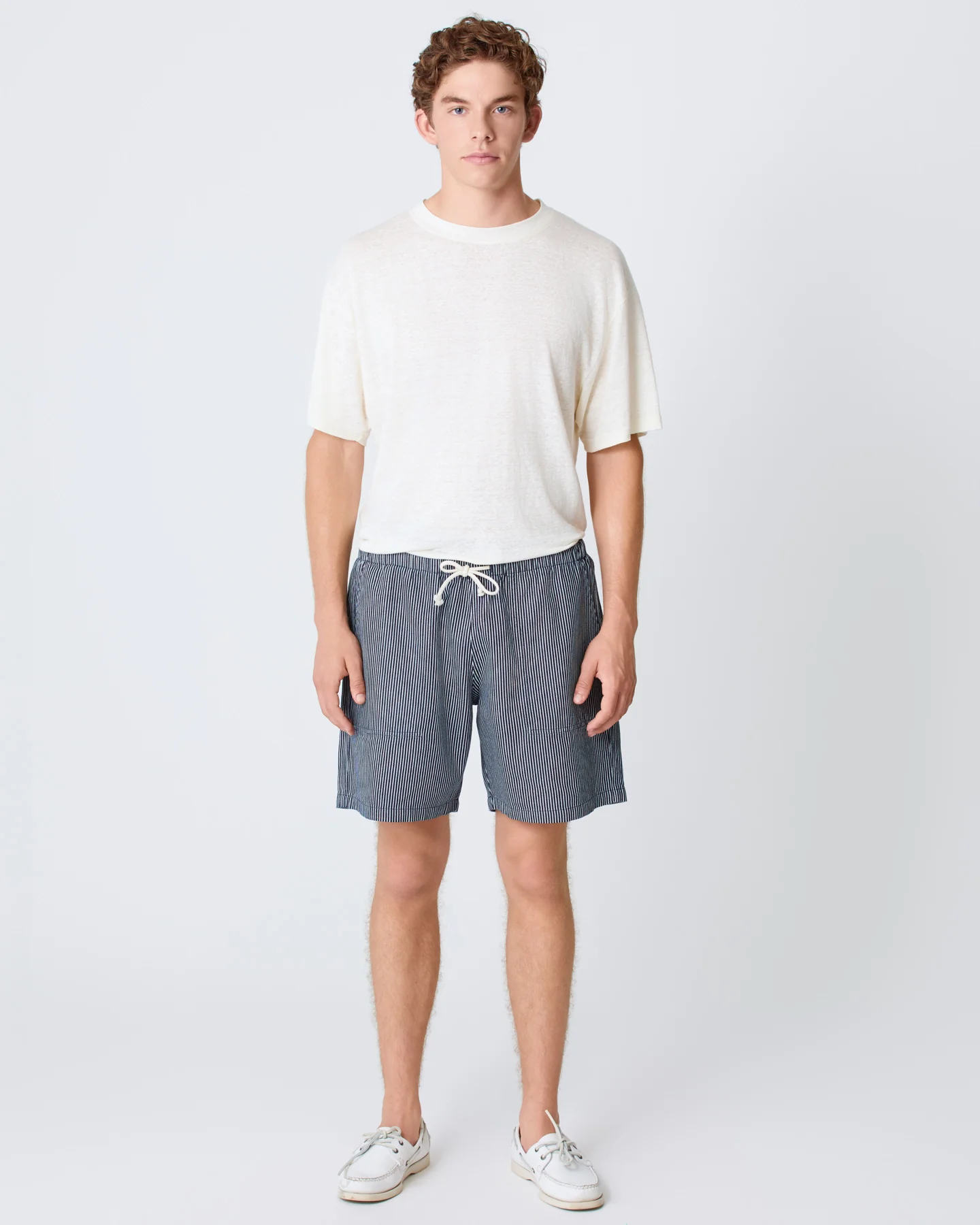 With the same fit as our baby cord shorts, this version is crafted in 100% organic cotton with dark navy stripes and finished with a small logo tab on the pocket.